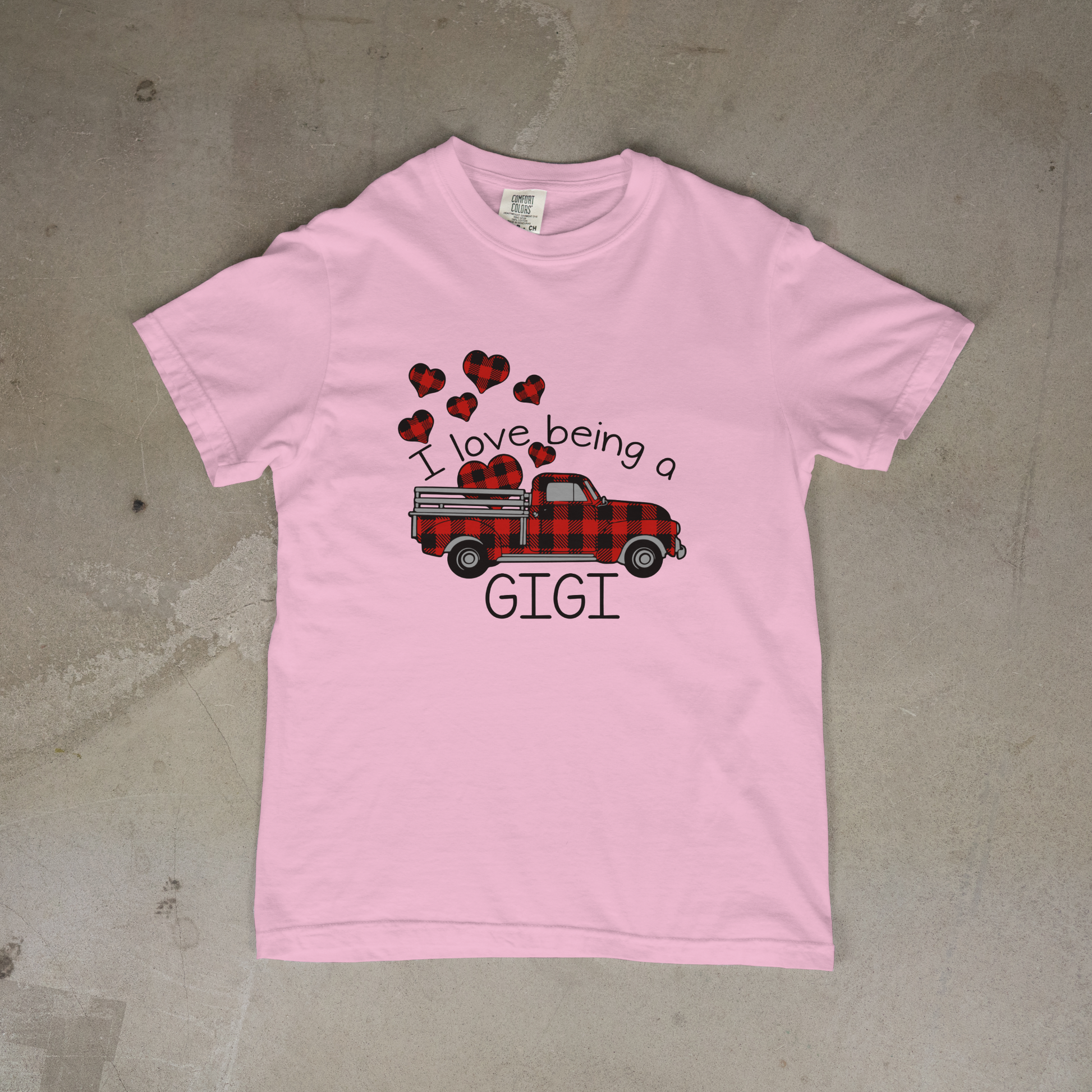 Celebrate the special bond between grandma and grandchild with this charming tee. Featuring a bold red and black checkerboard truck adorned with matching checkerboard hearts, it's the perfect way to show off your GIGI pride. Soft, comfortable, and ready for everyday wear, this playful design makes a heartfelt gift for grandmothers who love their grandkids as much as they love a good laugh.